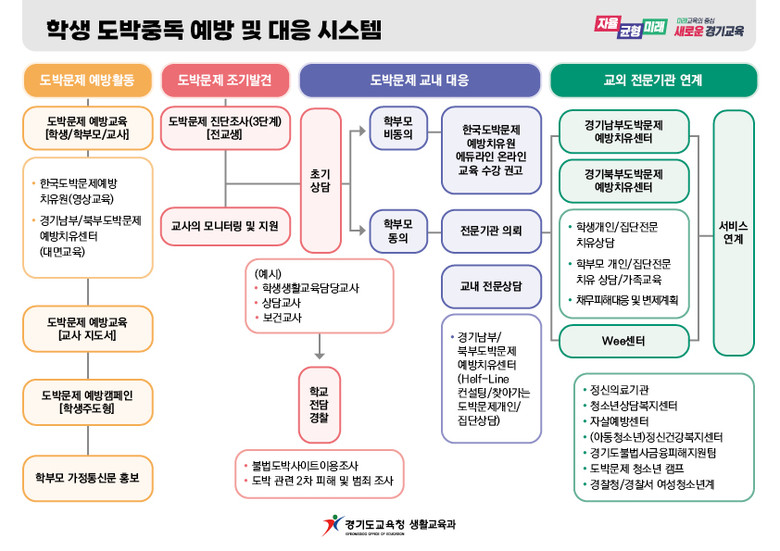 경기도교육청은 학생이 안전하고 건강한 환경에서 스스로 꿈과 미래를 살아갈 역량을 기르는 것을 교육 목표로 삼고, 학생 도박 예방·근절 문화 확산을 위해 학교, 가정, 유관기관, 지역 사회가 서로 연대하여 예방 교육을 지속적으로 추진하겠다고 밝혔다.